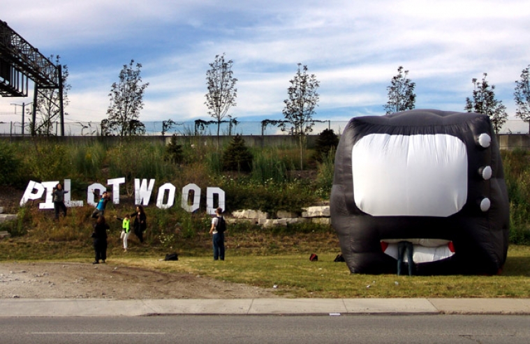 D- So you have talked about the ways in which Pilot responded to the conference and protest models of social space, but what about the Hollywood influence? When I rode my bike down to Bridgeport (the neighborhood in Chicago where Pilot took place), I came across a huge sign on the hill by the highway reading “PILOTWOOD.” Hollywood is a pretty messed up place in a lot of ways, how did it serve as inspiration?
