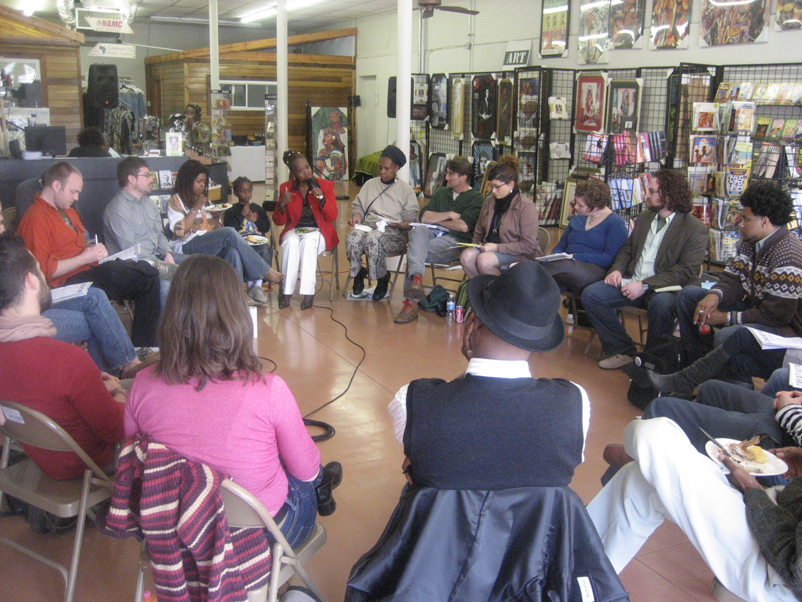 [New Orleans – at the Community Book Center] Willie Birch, Kyle Bravo and Jenny LeBlanc, Asali DeVan, Adella Gautier, M. Brady McKellar & Elsa Dimitriadis, Darryl Montana, Brandan Odums, Kathy Randals, Damon Rosenzweig, Mathew Schwarzman, Natalie Sciortino-Rinehart, Nick Slie,Rebecca Snedeker, Elizabeth Underwood, Vera Williams
