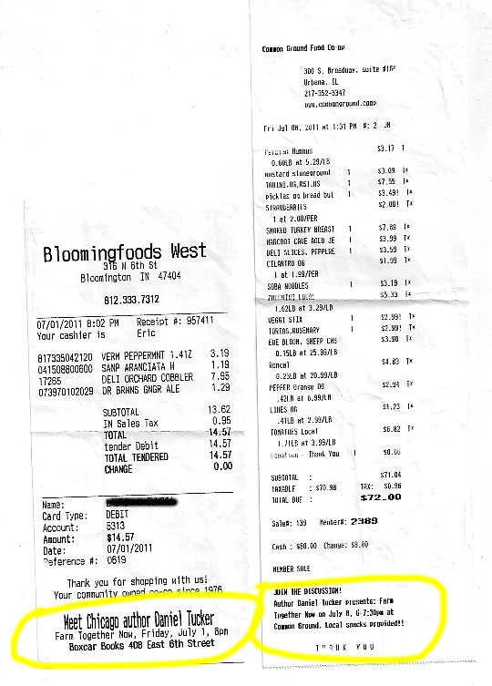 Thanks for your support, for the wonderful reviews, and for coming out to these events. Thanks to the farmers who we profiled for being so open and generous. And thanks especially to the folks at Bloomingfoods (Bloomington, IN) and Common Ground (Urbana, IL), two food co-ops that uses the viral power of their customer receipts to promote our readings. What a great idea! If there is one lesson to be learned by self-organizing a 25 event national tour its that it is hard work to get a room full of engaged people to discuss food politics and farmers stories.